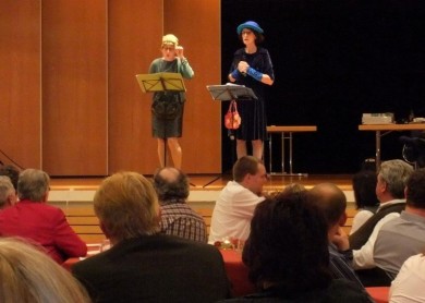 Dietlinde Ellsässer und Ida Ott, bekannt als das Duo „Hanni und Fanni“, durchleuchteten in ihrem Bühnenprogramm den Verein sowie die aktiven Spieler des Harmonika Club.