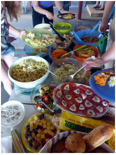 Da das Wetter trocken und recht mild war, konnten wir draußen sitzen. Die bereitgestellten Tische wurden schön dekoriert und das Salatbuffete füllte sich schnell.